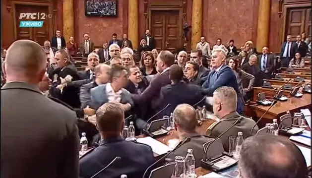 SARAJEVO, (Patria) - Tokom zasedanja u Skupštini Srbije došlo je do incidenta nakon što su zastupnici Boško Obradović i Ivan Kostić ušli u salu i unijeli transparente do skupštinske govornice.