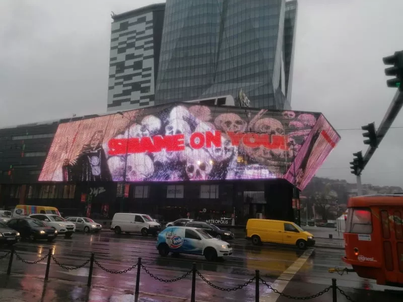 Povodom dodjele nagrade Handkeu, Udruženje žrtava i svjedoka genocida uputilo je poruku fotografijom emitovanom na reklamnom zidu trgovačkog centra Sarajevo City Centar.
