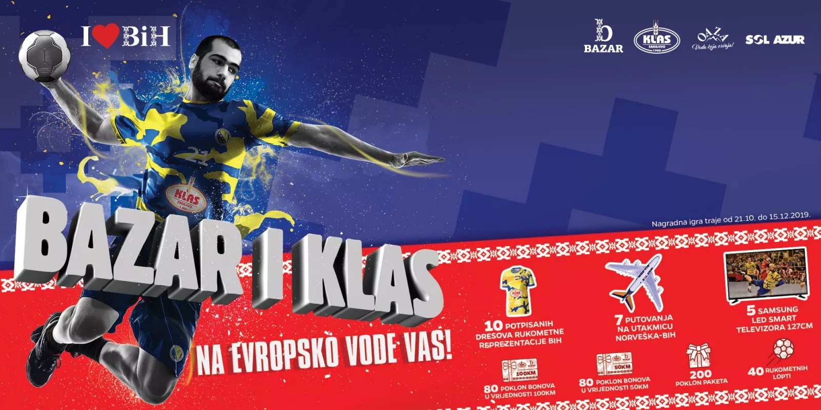 Osim putovanja u Norvešku, sretne dobitnike očekuje čitav niz vrijednih nagrada kao što su pet Samsung LED Smart TV 127 cm, 10 svojeručno potpisanih dresova reprezentacije Bosne i Hercegovine, 40 rukometnih lopti, 80 Bazar i Klas poklon bonova u vrijednosti od 100,00 KM i još toliko u vrijednosti od 50,00 KM, te 200 poklon paketa.