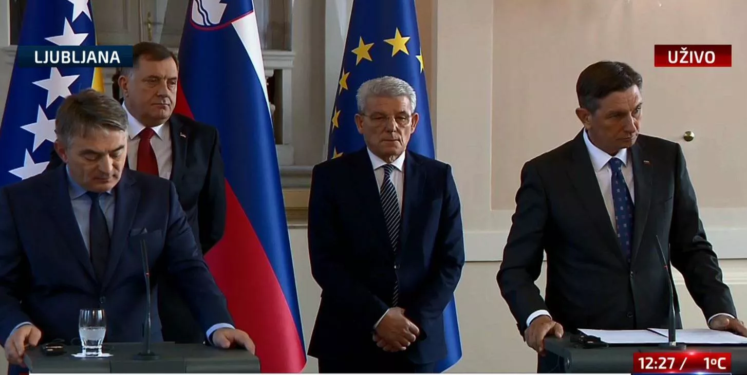 LJUBLJANA, (Patria) - Predsjedavajući i članovi Predsjedništva Bosne i Hercegovine Željko Komšić, Šefik Džaferović i Milorad Dodik sastali su se danas u Ljubljani sa predsjednikom Slovenije Borutom Pahorom. Nakon održanog sastanka uslijedilo je obraćanje Komšića i Pahora.