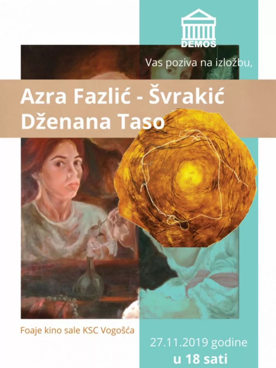 VOGOŠĆA, (Patria) - U srijedu, 27.11.2019. godine, sa početkom u 18:00 sati, u foajeu KSC-a Vogošća (Jošanička 33, Vogošća) održat će se izložba slika i grafika Azre Fazlić Švrakić i Dženane Taso u organizaciji Udruženja Demos u sklopu projekta "Afirmacija mladih umjetnika". Na početku izložbe obratit će se Haris Ćutahija, program koordinator projekta i obje umjetnice.