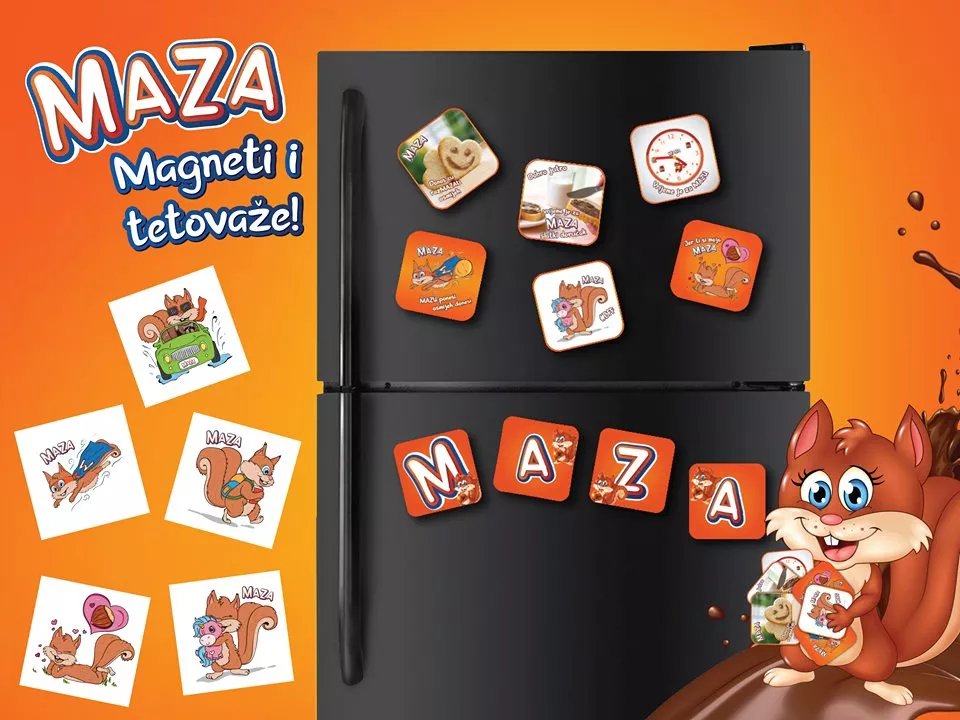 Kupovinom bilo kojeg kremnog namaza MAZA 700 grama, na polici ćete moći pronaći flat magnet koji vas najbolje opisuje. Ako ste kolekcionarski orijentisani tu su i „M“ „A“ „Z“ „A“ koje ćete morati skupiti odvojeno kako biste na kraju imali MAZA logo u punom sjaju na svom frižideru.