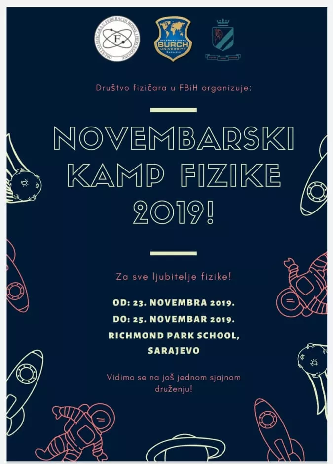 SARAJEVO, (Patria) - U organizaciji Društva fizičara u FBiH u saradnji sa obrazovnim institucijama Richmond Park Schools i Internacionalnim Burch Univerzitetom od 23. do 25. novembra 2019. godine bit će održan kamp fizike.