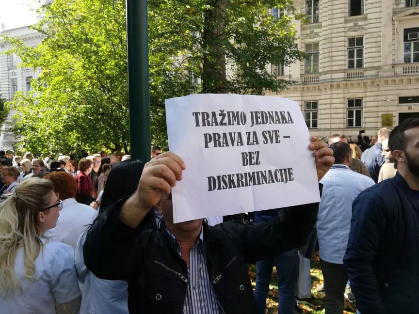 “Ovaj sindikat nije pristao na pokušaj vlasti da učini novu diskriminaciju, ali u našim redovima – da nekome date, a nekome ne date. Predložili smo da potpišemo naš stari kolektivni ugovor koji već vrijedi, međutim u tom kolektivnom ugovoru je koeficijent specijaliste 4,50, a u našem novom prijedlogu tražimo 5,40, kako stoji u doktorskom kolektivnom ugovoru. Odustali smo apsolutno od svega, ostalo je samo uskladiti koeficijente, zbog nepravde koja je učinjena sklapanjem Kolektivnig ugovora, doktorskog i našeg, u novembru 2017. godine”, kazao je Selimić.