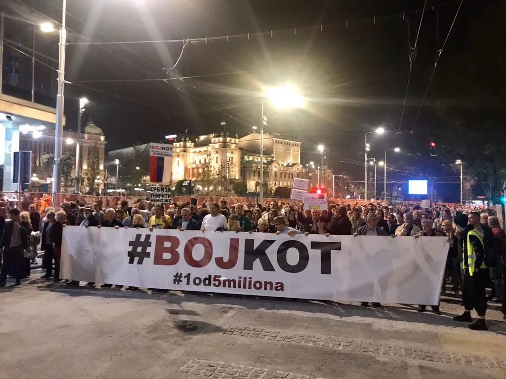 U povorci na čijem je čelu veliki transparent "Bojkot" građani su sinoć zastali kod zgrade Predsjedništva Srbije i skandirali protiv predsjednika države Aleksandra Vučića.