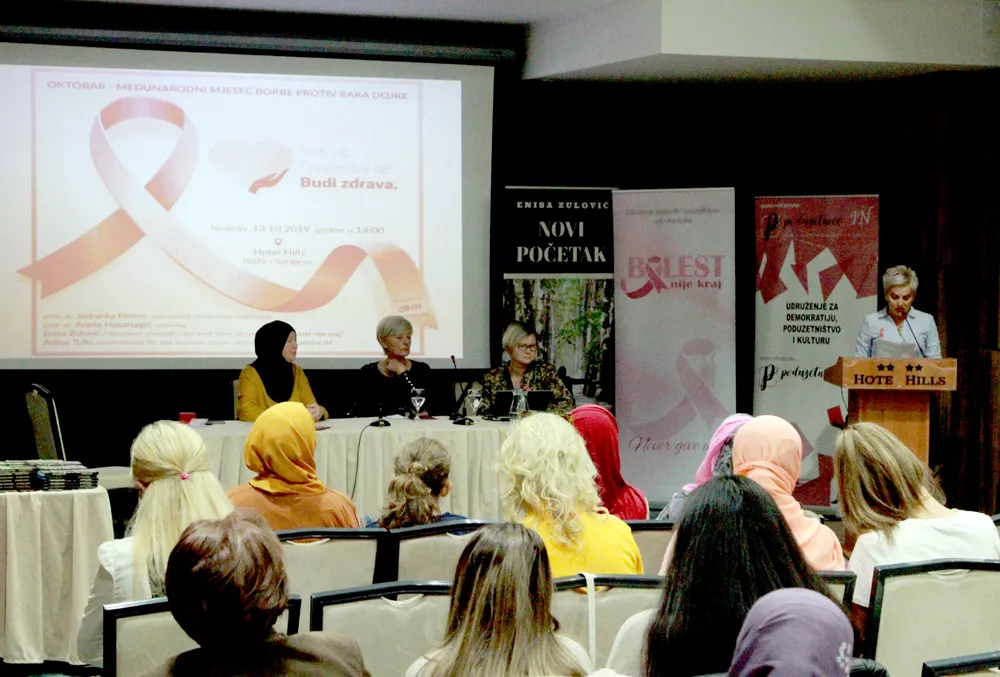 SARAJEVO, (Patria) - Mjesec oktobar je međunarodni mjesec prevencije karcinoma dojke. Različitim manifestacijama i aktivnostima tokom ovog mjeseca nastoji se potaknuti i povećati svijest ženske populacije o učestalosti i težini ovog oboljenja. Udruženje koje okuplja žene liječene od karcinoma dojke “Bolest nije kraj” u saradnji sa Udruženjem “PoduzetniceIN”, koje mahom okuplja kreativne i proaktivne poslovne žene, 13. oktobra, organizovale su predavanja “Voli se, pregledaj se, budi zdrava – prevencija karcinoma dojke” i dali svoj doprinos u nastojanju da povećaju svijest žena o samopregledu i prevenciji, kao zaštiti od ove opake i često smrtonosne bolesti.