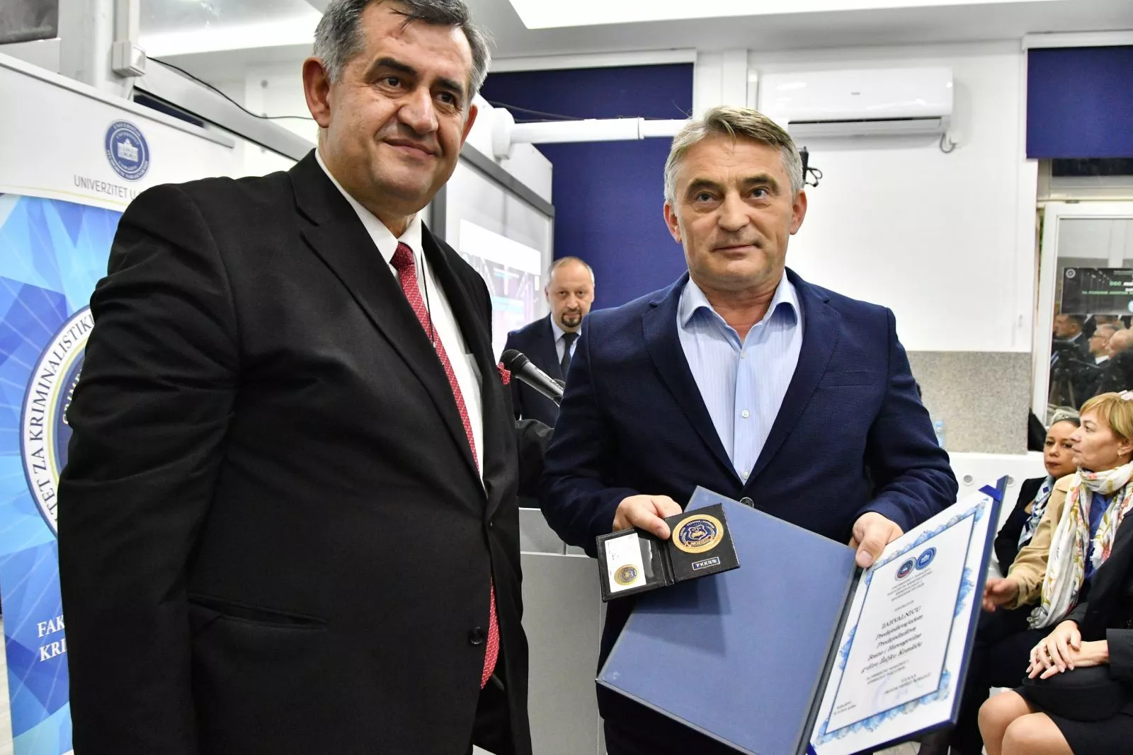 "Zahvaljujem kolektivu Fakulteta za kriminalistiku, kriminologiju i sigurnosne studije za ukazano povjerenje i dodijeljeno priznanje. Zadovoljstvo mi je što prisustvujem otvaranju 18. po redu Međunarodne naučne konferencije „Dani kriminalističkih nauka“ o temi „Savremeni izazovi u cyber-sigurnosti“. Ova tema je izuzetno važna za čitav svijet. Živimo u dobu koje nazivaju informatičkom revolucijom, dobu koje je donijelo velike promjene na globalnom nivou, pa tako i u Bosni i Hercegovini.Svijet se mijenja munjevitom brzinom, suočavamo se s velikim izazovima na međunarodnom i lokalnom nivou, a jedan od tih izazova je svakako razvoj informatičke i komunikacione tehnologija.Svijet je postao jedinstven sistem, a veze između pojedinaca danas se ostvaruju u trenutku, a sve zahvaljujući naprednim tehnologijama. Brzi razvoj tih tehnologija i olakšan pristup naprednim alatima olakšali su nam poslovni i svaki drugi vid komunikacije, međutim, kako izreka kaže, to je mač sa dvije oštrice", rekao je Komšić u obraćanju.