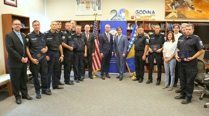 (Patria) - U Ambasadi Sjedinjenih Američkih Država u BiH održana je svečanost predaje certifikata zahvalnosti policijskim službenicima Direkcije za koordinaciju policijskih tijela BiH. Ambasador SAD u BiH, Erik Nelson je uručio policijskim službenicima Direkcije koji rade na obezbjeđenju objekata američke Misije u BiH, zahvalnice za predan i profesionalan rad u prethodnom periodu čime su doprinijeli da diplomatsko osoblje i uposlenici Ambasade SAD u BiH rade nesmetano i u bezbijednom okruženju.