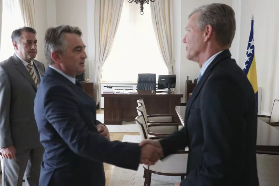 SARAJEVO, (Patria) - Predsjedavajući Predsjedništva Bosne i Hercegovine Željko Komšić primio je danas u oproštajnu posjetu Šefa misije OSCE-a u BiH Bruce G. Bertona.