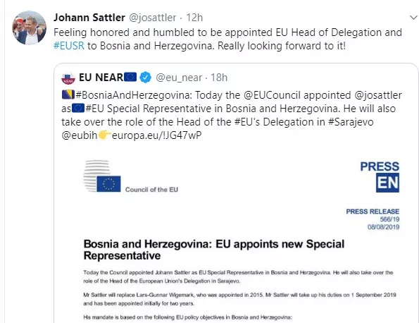 SARAJEVO, (Patria) - Johann Sattler, novoimenovani specijalni predstavnik EU i šef Delegacije EU u BiH koji preuzima dužnost 1. septembra oglasio se na Twitteru nakon što je i zvanično potvrđeno njegovo imenovanje.