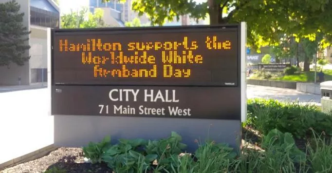 Na elektronskom panou ispred Skupštine ovog grada napisano je "Hamilton podržava Međunarodni dan bijelih traka".