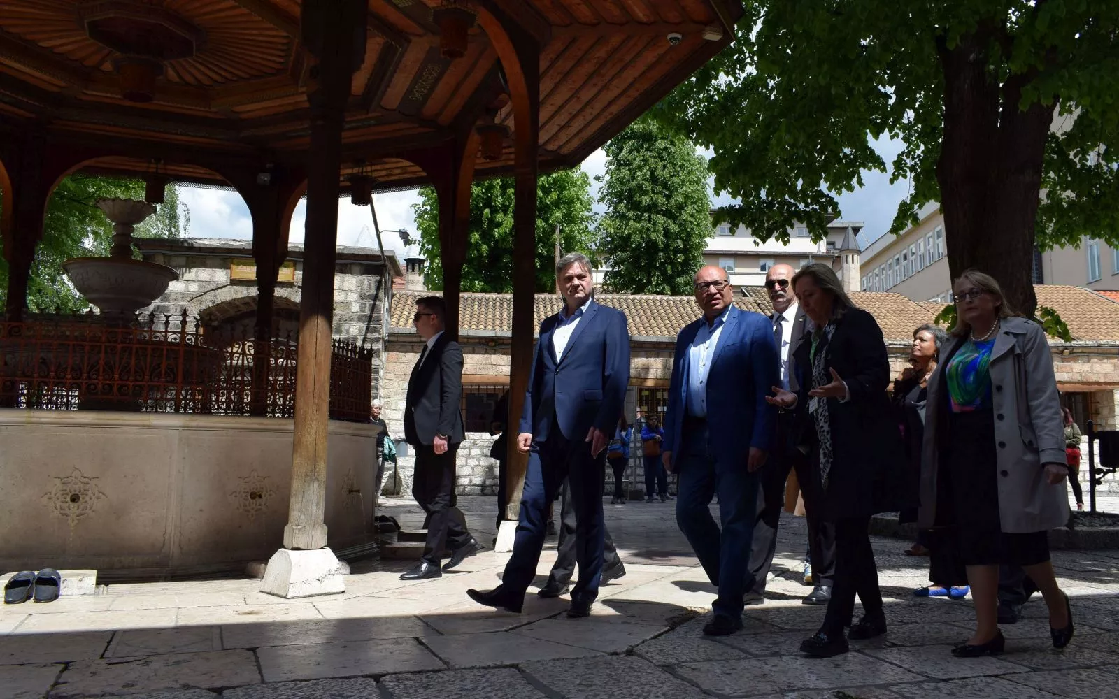 SARAJEVO, (Patria) - Predsjedavajući Vijeća ministara BiH Denis Zvizdić prošetao je danas starim dijelom Sarajeva sa predsjednikom EBRD-a Suma Chakrabartijem, njegovom suprugom i gostima iz EBRD-a. Tom prilikom posjetili su Galeriju 11/07/95 i Bošnjački institut.