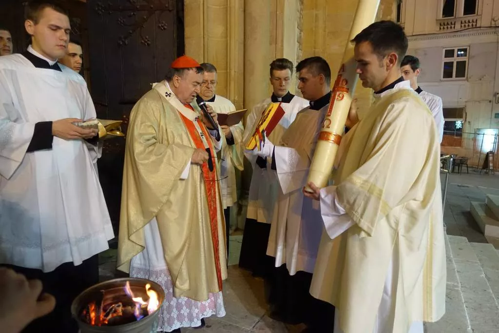 Na početku Mise bdijenja kardinal Puljić je blagoslovio oganj na stepeništu katedrale te urezao u uskrsnu svijeću križ i prvo i zadnje slovo grčkog alfabeta - alfa i omega kao znak Krista kojem pripadaju „vremena i vjekovi“. Potom je na krakove i u sredinu križa, na kojem su brojevi tekuće 2019. godine, utisnuo pet zrna tamjana koji označuju pet rana Krista raspetoga. Nakon što je zapalio i pokadio uskrsnu svijeću - simbol Krista koji je svjetlo svijeta što rasvjetljuje tamu noći, preuzeo ju je đakon Štefan koji ju je, noseći je u procesiji, na tri mjesta podigao svaki put zapjevavši: Svjetlo Kristovo, a svi bi otpjevali: Bogu hvala. Pošto je uskrsna svijeća postavljena na svijećnjak u svetištu katedrale i pokađena, đakon Štefan otpjevao je Uskrsni hvalospjev koji počinje pozivom na kličuću radost upravljenu korovima anđela, zemlji „obasjanoj blijeskom“ i preobučenoj Majci Crkvi, koja „sja s tolikoga svjetla“.