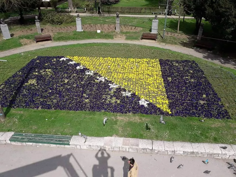 SARAJEVO, (Patria) - Cvjetna državna zastava, koju je izradilo preduzeće "Park" u Malom parku, preko puta zgrade Predsjedništva BiH ovih dana posebno privlače pažnju prolaznika.