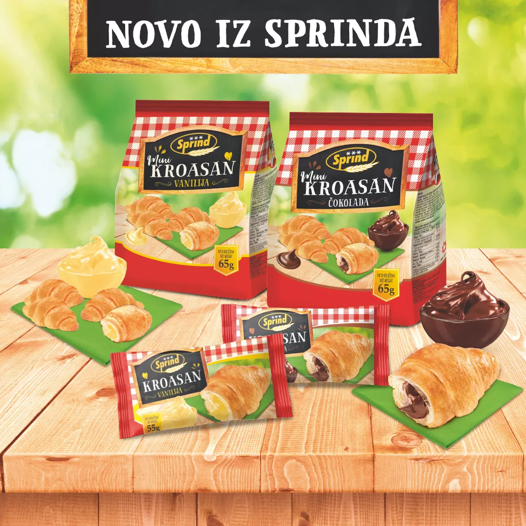 Sprind kroasani su odličan brzi obrok, na pauzi u školi ili poslu, poslastica za počastiti sebe ili svoje najmilije, te izvrstan slatki dodatak uz kafu - dnevna doza slatkog i ukusnog. Radi se o 100% domaćem proizvodu. U odnosu na druge domaće proizvode iz kategorije, Sprind kroasan razlikuje bogata aroma i veća količina punjenja, u besprijekornom lisnatom tijestu. Proizvodi su dostupni u dvije vrste punjenja - slatka čokolada i kremasta vanilija.