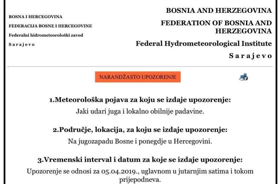 „Jaki udari juga od 40 do 60 km/h, na jugozapadu Bosne povremeno i olujni od 60 do 70 km/h. Obilnije padavine se očekuju na jugozapadu Bosne, na sjeveru, zapadu i jugu Hercegovine. Očekivana količina padavina od 30 do 60, lokalno do 80 l/m.2“, kažu iz Federalnog hidrometeorološkog zavoda.
