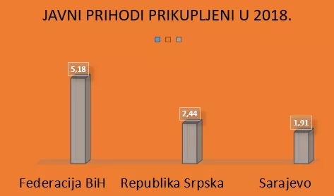 Federacija BiH je u istom razdoblju naplata 5,18 milijardi KM javnih prihoda. U odnosu na 2017. godinu to je povećanje za 362.114.860 KM ili za 7,51 posto. Prema podacima Porezne uprave FBiH najviše javnih prihoda u FBiH je prikupljeno u Sarajevu i to 1.914.275.443 KM.