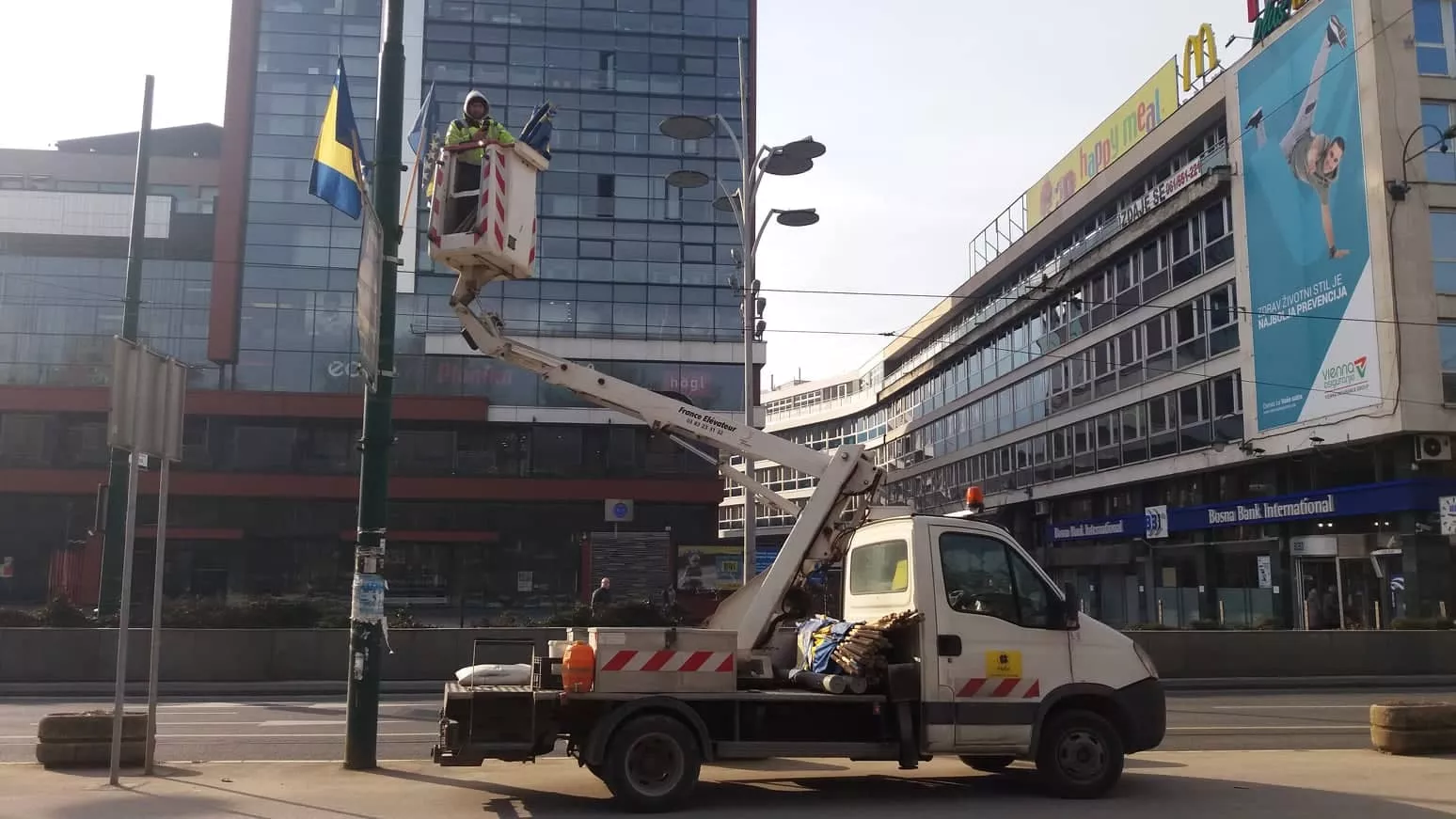 SARAJEVO, (Patria) - Radnici preduzeće „Park“ postavljanjem državnih zastava u postolja koja se nalaze na stubovima javne rasvjete jutros su započeli ukrašavanje većih sarajevskih ulica i trgova povodom Dana nezavisnosti BiH, koji se obilježava u petak.