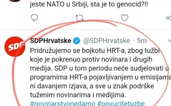 "SDP u tom periodu neće sudjelovati u programima HRT-a pojavljivanjem u HRT-ovim emisijama ni davanjima izjava za HRT, a sve u znak snažne podrške tuženim novinarima i medijima", saopćili su.
