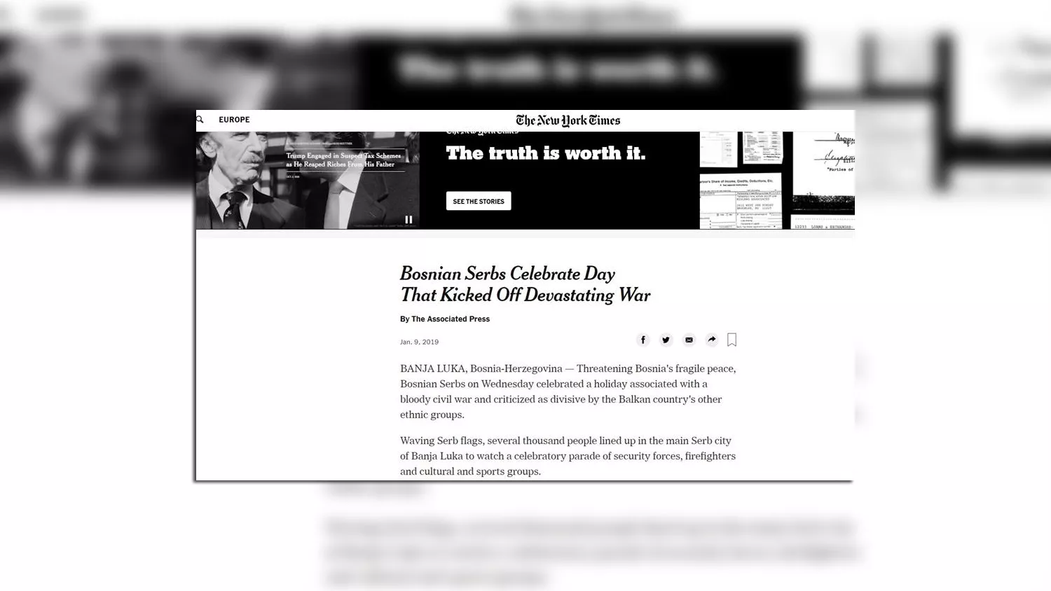 New York Times dalje piše kako kako „9. januar obilježava datum kada su 1992. godine bosanski Srbi proglasili osnivanje svog entiteta u BiH, potpaljujući tako četverogodišnji rat u kojem je stradalo više od 100.000 ljudi, a milione ostavio bez domova“.