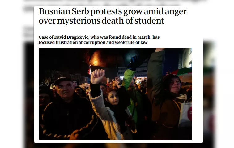 LONDON, (Patria) - Ugledni londonski The Guardian podsjetio je u današnjem izdanju prostor i protestima građana u Banja Luci, koji traže istinu i pravdu za ubijenog mladića Davida Dragičevića.