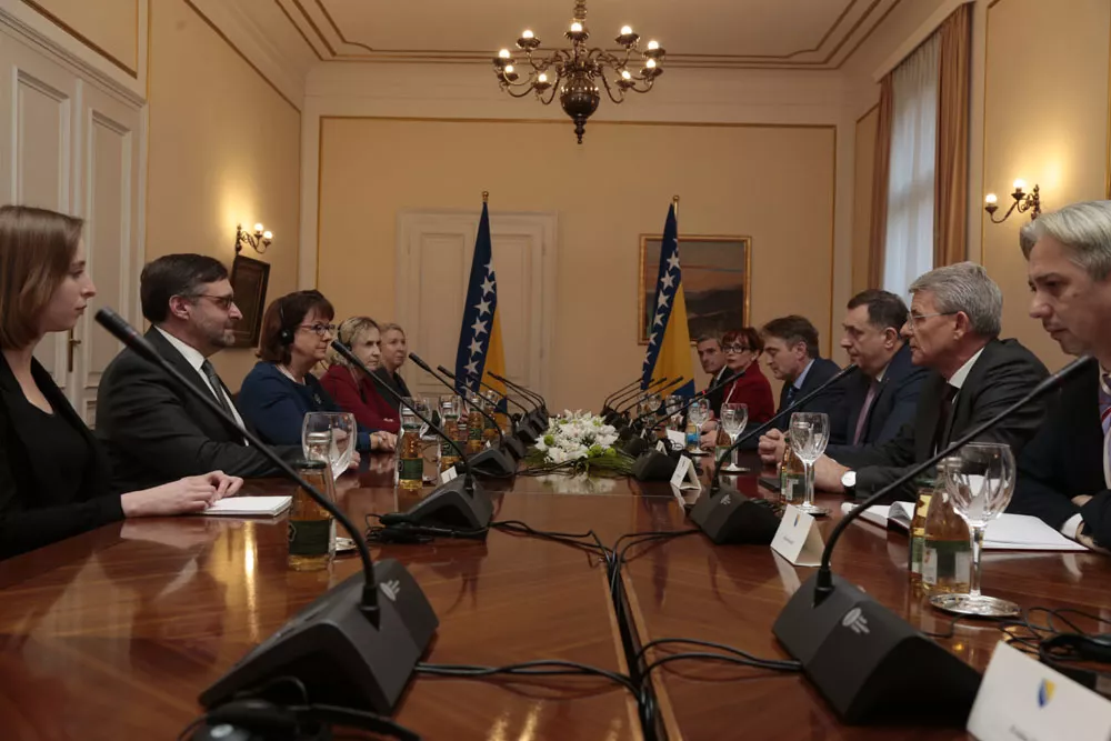 SARAJEVO, (Patria) - Predsjedavajući Predsjedništva BiH Milorad Dodik i članovi Predsjedništva BiH Željko Komšić i Šefik Džaferović počeli su u zgradi Predsjedništva BiH sastanak s delegacijom Sjedinjenih Američkih Država.