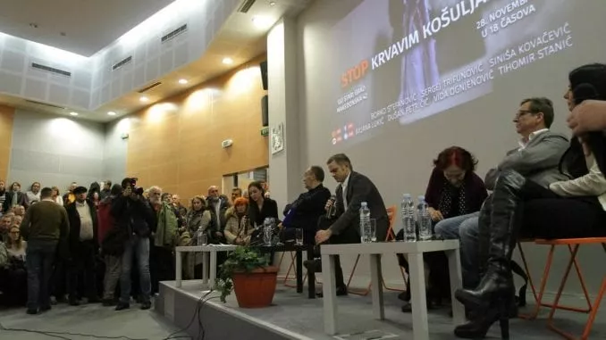 Treba nam veći prostor, uzviknuo je neko iz publike, aludirajući na mnoštvo onih koji su ostali u lobiju ispred sale opštine Stari grad, jer prostor nije mogao da primi sve građane koji su došli da kažu odlučno ne „krvavim košuljama“.