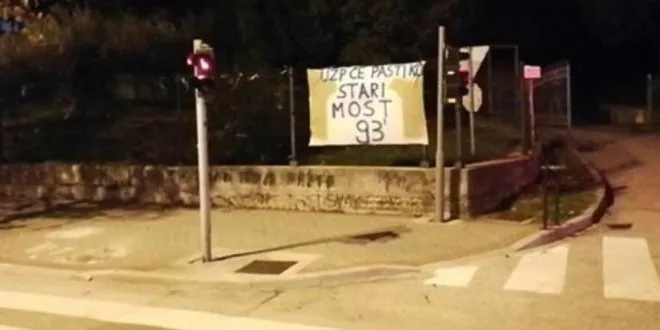 MOSTAR, (Patria) - Na ogradi biskupske rezidencije u Mostaru postavljen je transparent na kojem piše ”UZP će pasti ko Stari most ’93”.