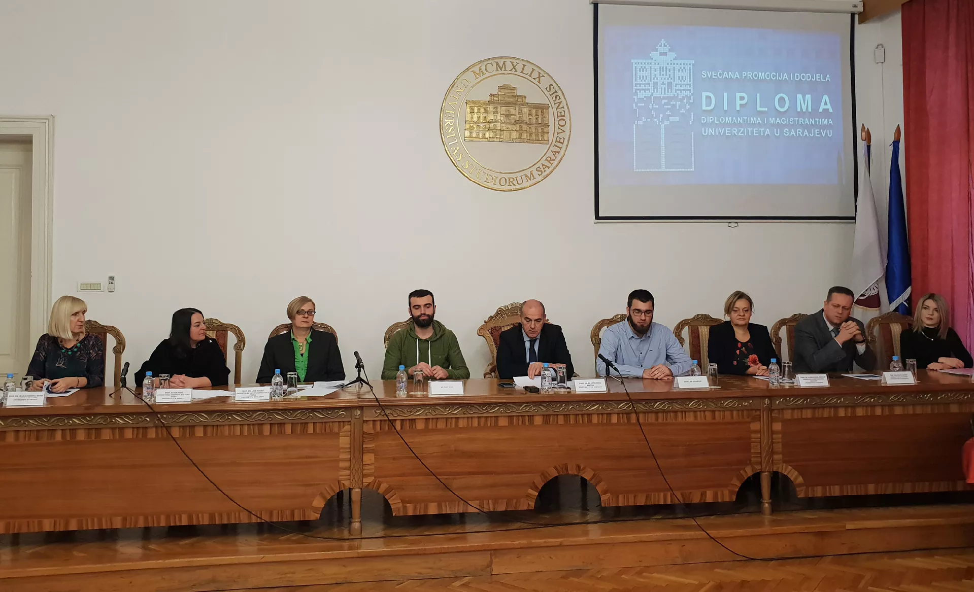 SARAJEVO, (Patria) - Povodom održavanja Svečane promocije i dodjele diploma diplomantima i magistrantima Univerziteta u Sarajevu, u srijedu 28. novembra 2018. godine u Rektoratu Univerziteta u Sarajevu održana je konferencija za medije na kojoj su učestvovali prof. dr. Rifat Škrijelj, rektor Univerziteta u Sarajevu, i prorektori prof. dr. Aida Hodžić, prof. dr. Aleksandra Nikolić, prof. dr. Elvir Čizmić, prof. dr. Maida Čohodar-Husić i prof. Sanja Burić, i gospođa Rijana Jusufbegović, studentica-prorektorica. Prisutni su bili i najbolji studenti prvog ciklusa studija u 2018. godini: Abdulah Jašarević i Demir Papić, obojica sa Prirodno-matematičkog fakulteta i ostvarenim prosjekom 10,00.