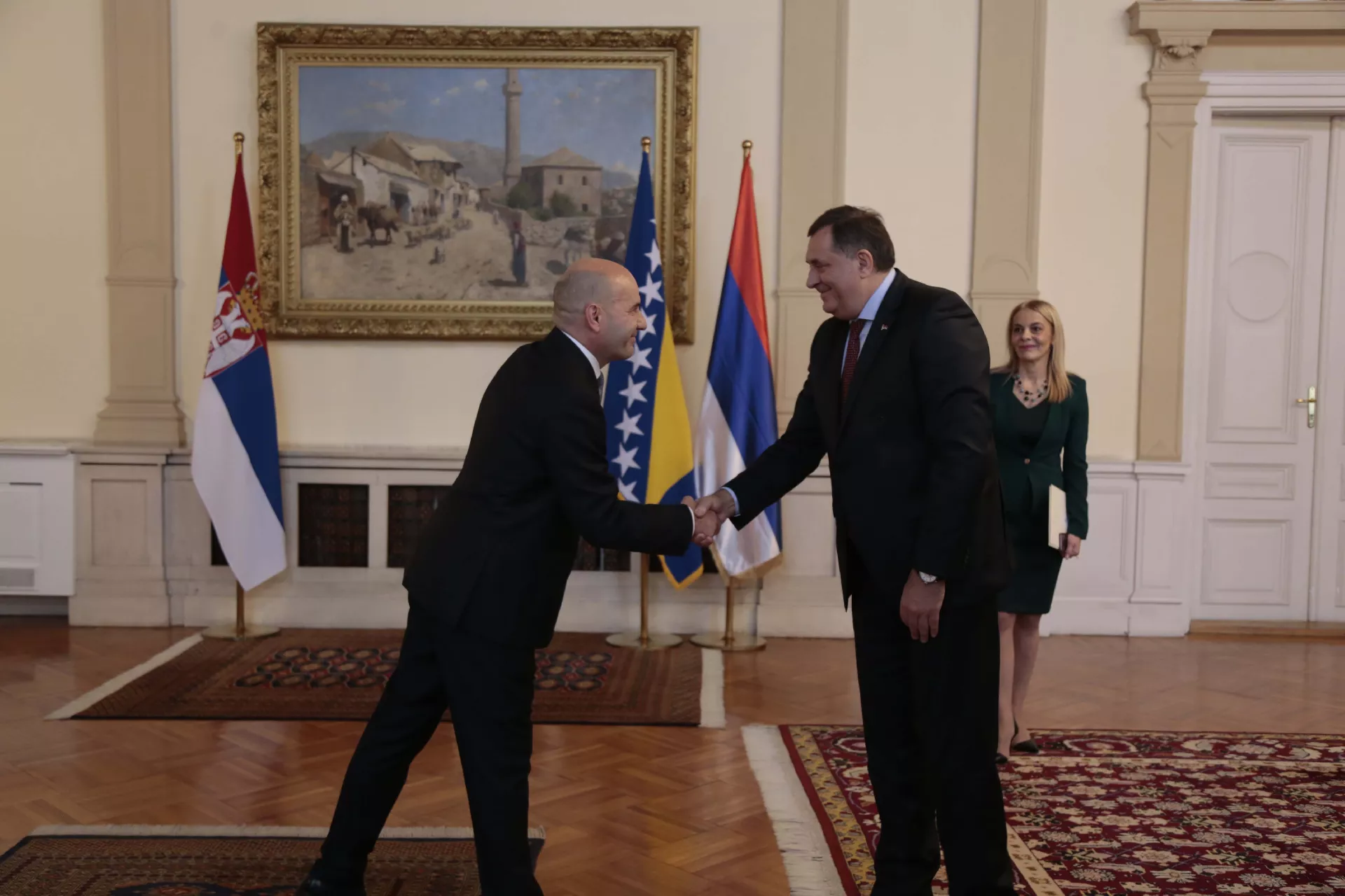 SARAJEVO, (Patria) - Predsjedavajući Predsjedništva BiH Milorad Dodik primio je u zgradi Predsjedništva u Sarajevu akreditivno pismo novoimenovanog ambasadora Republike Srbije u Bosni i Hercegovini Aleksandra Đorđevića.