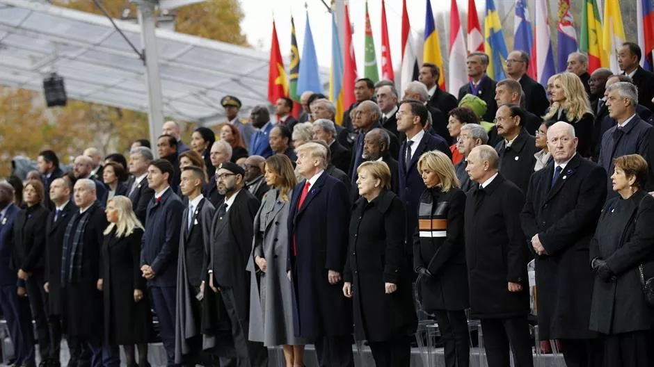 Makron je podsjetio na, kako je rekao krvavi Prvi svjetski rat i njegove žrtve i rekao da danas historija prijeti da se ponovi, i da je odgovornost čelnika okupljenih u Parizu da "prenesu našoj djeci svet o kom su generacije sanjale".