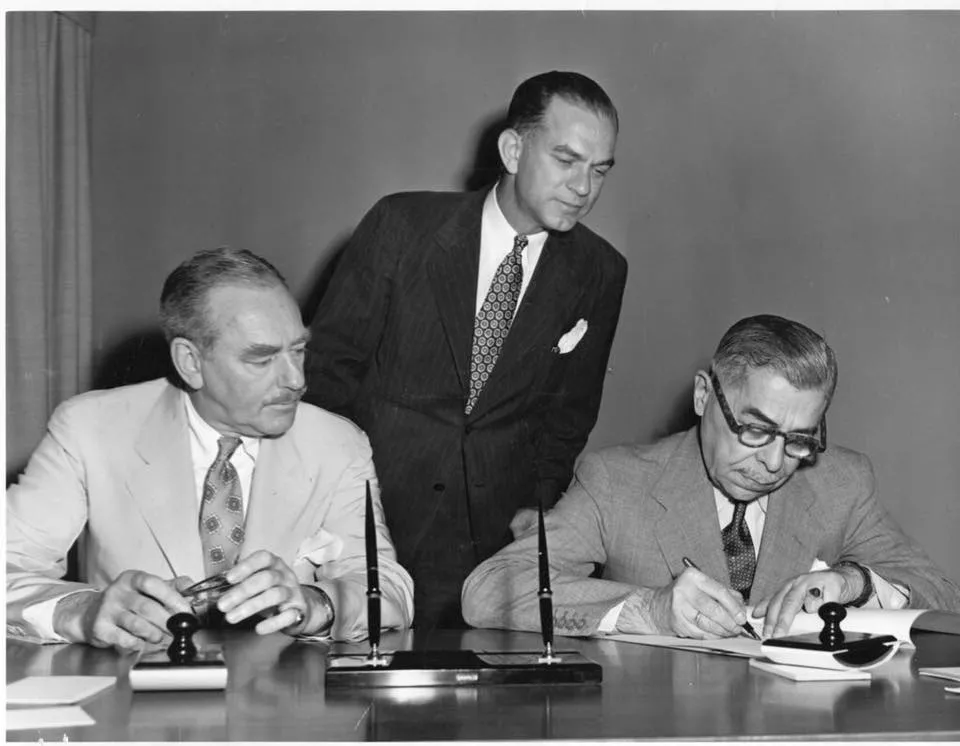 Predsjednik SAD-a Harry S. Truman potpisao Fulbright program 1. avgusta 1946. godine u ovalnoj kancelariji Bele kuće. Iza predsjednika Trumana je senator James William Fulbright (lijevo) i neidentifikovani čovjek
