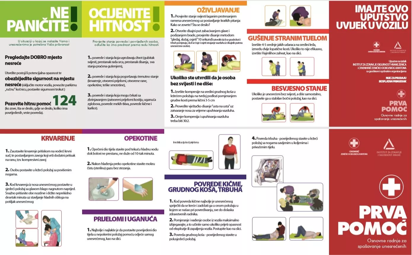 Uz edukacije, polaznicima će biti distribuirani štampani materijali sa osnovama prve pomoći u vidu brošura i knjiga, te plakata sa prikazanim osnovnim smjernicama za prvu pomoć kod iznenadnih stanja ili oboljenja (snižen nivo šećera u krvi – hipoglikemija, astmatični napad, epileptični napad, gušenje stranim tijelom).