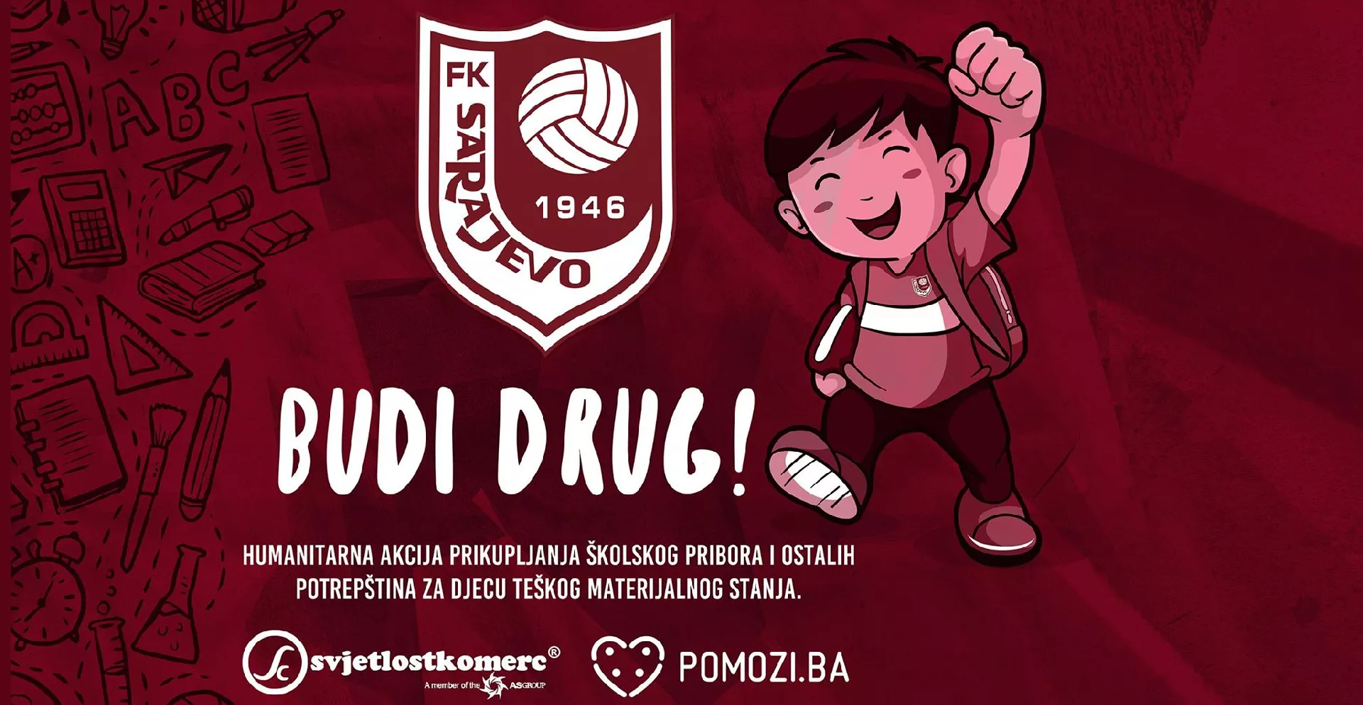 SARAJEVO, (Patria) - Fudbalski klub Sarajevo u saradnji sa partnerima Svjetlostkomerc d.d. Sarajevo i Pomozi.ba, organizuje humanitarnu akciju “BUDI DRUG”, sa ciljem prikupljanja školskog pribora za djecu teškog materijalnog stanja.
