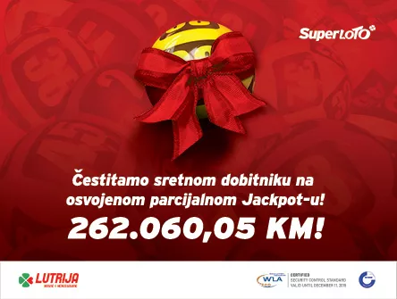Sretni dobitnik 262.060,05 KM na SuperLOTO-u, koji je izvučen 11. avgusta ove godine, mladi je porodični čovjek iz Sarajeva. Dobitna kombinacija od šest brojeva na parcijalnom sistemskom listiću ovom sretnom dobitniku donijela je izuzetno vrijedan novčani dobitak koji je danas naplatio u direkciji Lutrije Bosne i Hercegovine, saopćeno je iz ove kompanije.