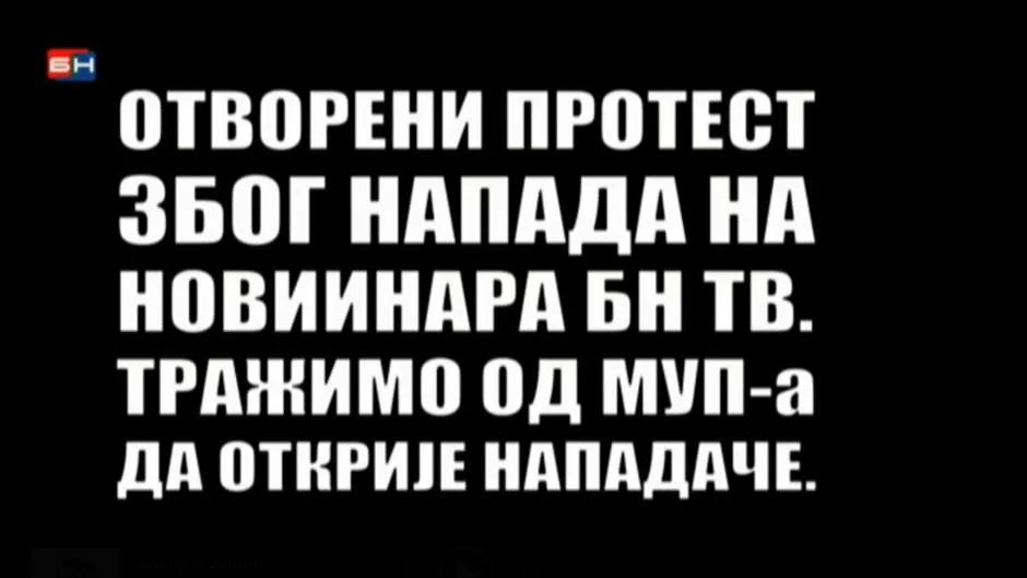 Na ekranu je bilo ispisano "Otvoreni protest zbog napada na novinara BN TV. Tražimo od MUP-a Republike Srpske da otkrije napadače".