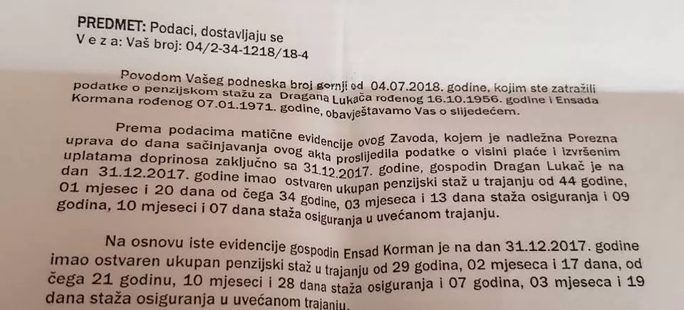 Novinska agencija Patria u posjedu je dokumenta koji je potpisao Zijad Krnjić, direktor Federalnog zavoda za penziono i invalidsko osiguranje a koji je NO zatražio od nadležnih organa. U dokumentu stoji da je Dragan Lukač na dan 31.12.2017. imao ostvaren ukupan penzijski staž u trajanju od 44 godine, jedan mjesec i 20 dana od čega 34 godine, 3 mjeseca i 13 dana staža osiguranja i 9 godina,10 mjeseci i 7 dana staža osiguranja u uvećanom trajanju.