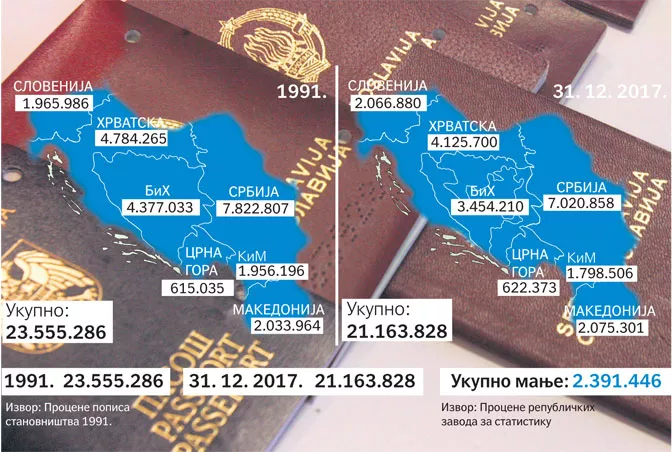 BEOGRAD, (Patria) - Na prostoru države koja se nekada prostirala od Vardara pa do Triglava danas živi oko dva i po miliona ljudi manje nego 1991. godine, kada je počeo raspad SFRJ, objavila je beogradska Politika.