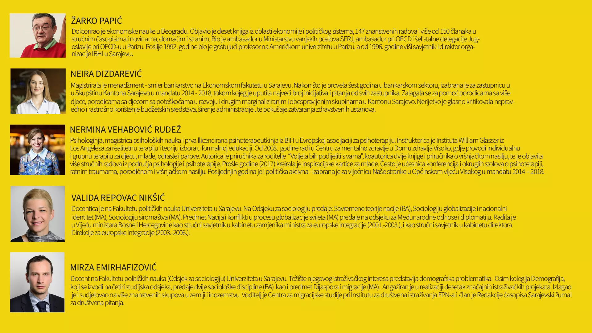 O navedenim temama će govoriti: Žarko Papić, analitičar i direktor Inicijative za bolju i humaniju inkluziju, Mirza Emirhafizović, docent na Odsjeku za sociologiju Fakulteta političkih nauka Univerziteta u Sarajevu, Nermina Vehabović-Rudež, psihologinja i psihoterapeutkinja i Neira Dizdarević, zastupnica u Skupštini Kantona Sarajevo.
