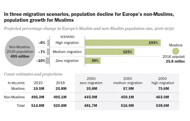 Sve u svemu, očekuje se da će broj stanovnika u Europi (uključujući i muslimana i nemuslimana) značajno padati (sa oko 521 miliona na oko 482 miliona), bez budućih migracija. U scenariju srednje migracije, ostat će otprilike stabilan broj stanovnika, a visoki migracijski scenarij bi trebao postati neznatan.