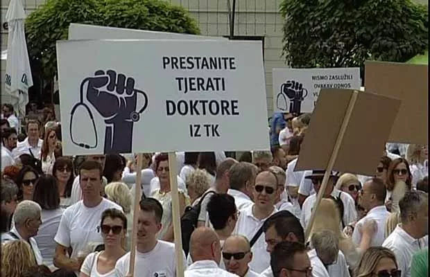 TUZLA, (Patria) - U Tuzli su danas protestirali članovi Strukovnog sindikata doktora medicine i stomatologije Tuzlanskog kantona (TK).