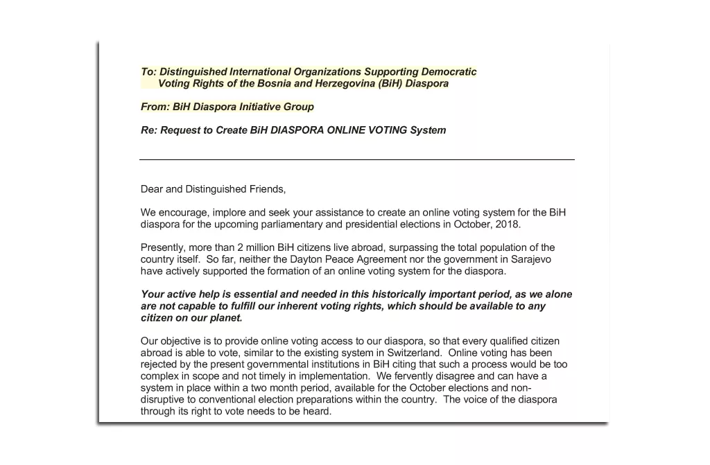 - Naš cilj je da osiguramo online glasački pristup našoj dijaspori, tako da svaki kvalifikovani građanin u inostranstvu može glasati, slično postojećem sistemu u Švajcarskoj. Online glasanje koje su odbacile aktuelne vladine institucije u BiH navodeći da bi takav proces bio suviše kompleksan po obimu i ne bi mogao biti blagovremeno proveden – navodi se u pismu.