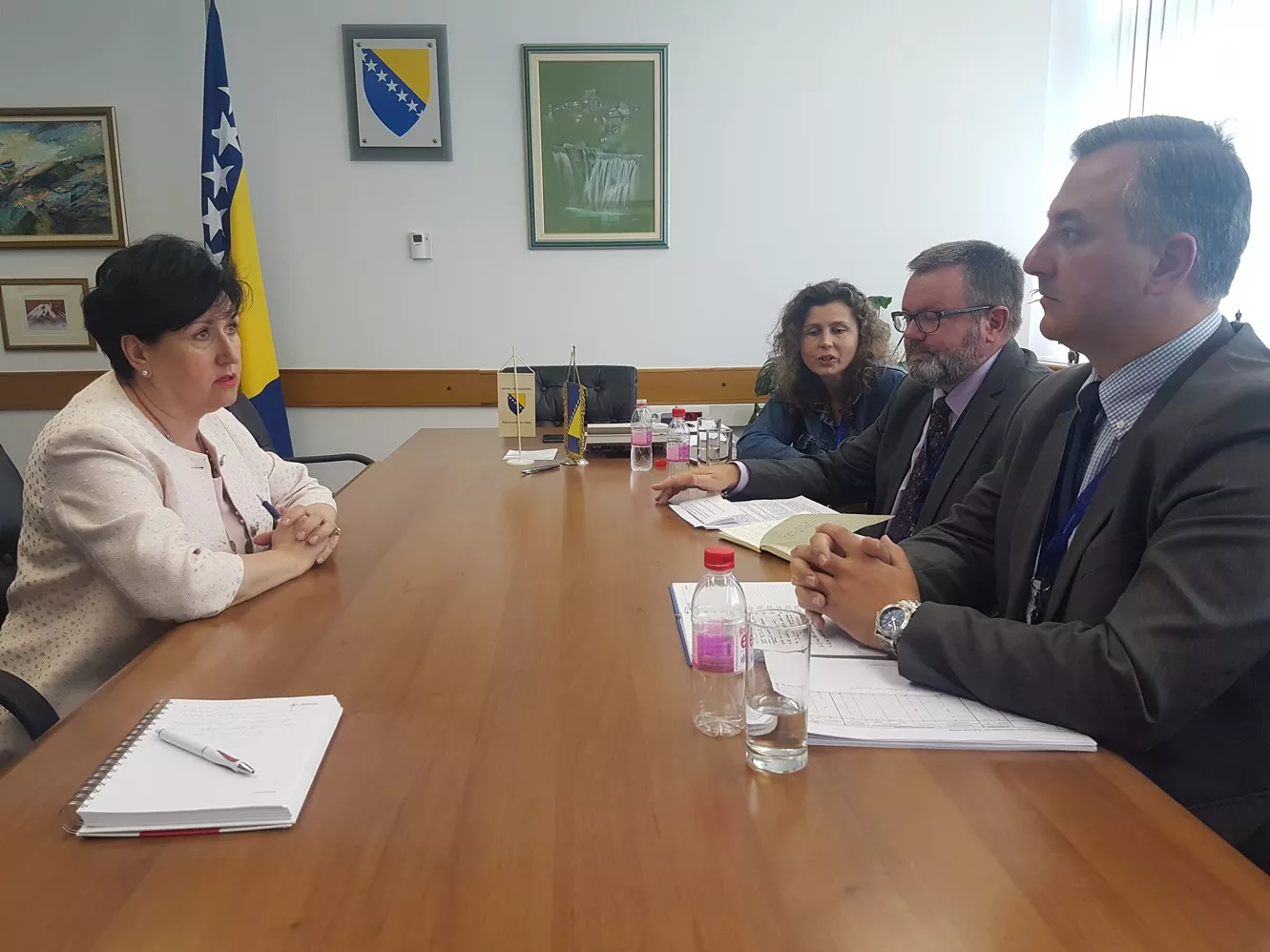 SARAJEVO, (Patria) - Državna ministrica za ljudska prava i izbjeglice Semiha Borovac sastala se danas sa Richardom Woodom, šefom Odjela za vladavinu prava u Uredu specijalnog predstavnika EU u BiH (EUSR) i njegovim saradnicima koji su pozdravio koordinirane aktivnosti institucija Bosne i Hercegovine u vezi sa novonastalom situacijom nakon priliva većeg broja migranata u našu zemlju.