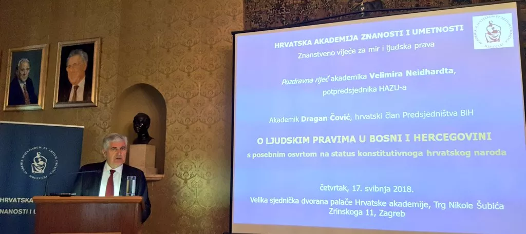 „Na poziv Hrvatske akademije znanosti i umjetnosti Republike Hrvatske, Znanstvenog vijeća za mir i ljudska prava, govorim 'O ljudskim pravima u Bosni i Hercegovini s posebnim osvrtom na status konstitutivnoga hrvatskog naroda'", napisao je Čović.