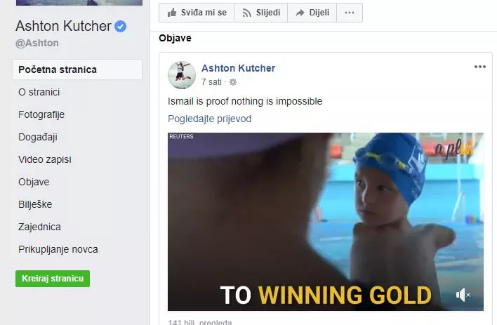 SAD, (Patria) - Holivudski glumac Ešton Kučer Ashton Kutcher na svom zvaničnom Facebook profilu koji ima više od 18 miliona fanova podijelio je video o Ismailu Zulfiću - dječaku rođenom bez ruku, ali koji danas osvaja nagrade na takmičenjima u plivanju.