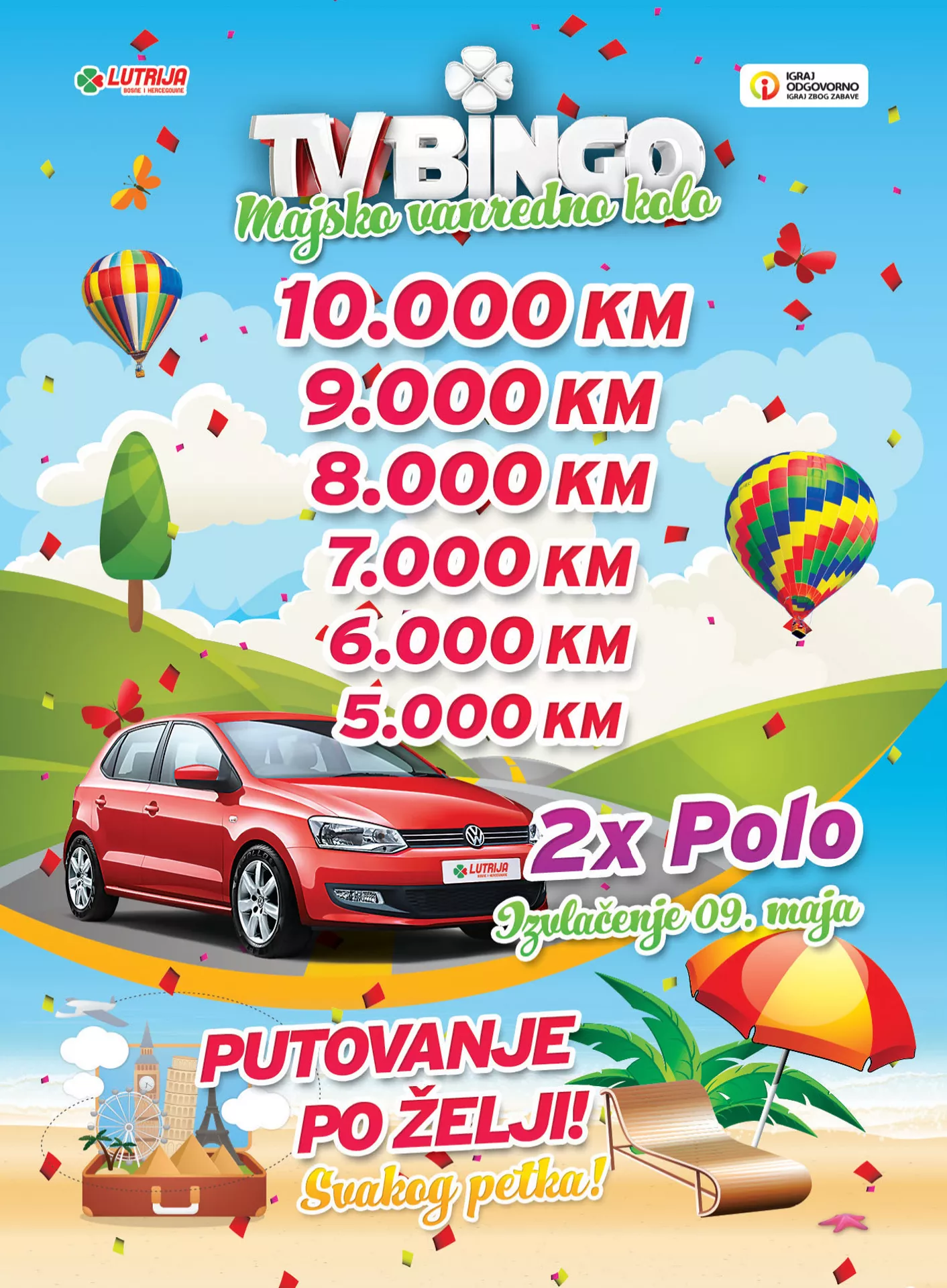 Pored redovnih novčanih dobitaka, deseteraca i peteraca, te Jackpota od 300.000,00 KM, majsko vanredno kolo TV Bingo donosi i obogaćeni fond kojeg čine dodatni vrijedni robno-novčani dobici. U večerašnjem vanrednom izdanju TV Binga igrači će imati mogućnost da osvoje dva automobila VW POLO, te dodatne novčane dobitke od 5.000,00-10.000,00 KM.