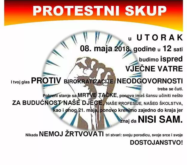 Iz Sindikata pozivaju prosvjetne radnika da se okupe kako bi iskazali nezadovoljstvo odnosom i Vlade KS i resornog ministra prema obrazovanju. Na pozivu na protestni skup koji je bio polijepljen po ulicama Sarajeva navodi se da prosvjetni radnici traže: