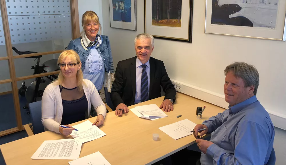 Direktori entitetskih uprava za geodetske i imovinsko-pravne poslove Željko Obradović i Bosiljka Predragović, u prostorijama Norveške uprave za katastar i mapiranje u Oslu, jučer su potpisali Ugovor o institucionalnoj suradnji na implementaciji donatorskog projekta koji financira Vlada Kraljevine Norveške. U ime implementacionog partnera Statens kartverk - Norveška uprava za katastar i mapiranje, Ugovor je potpisao direktor Sektora za međunarodnu saradnju Helge Onsrud.