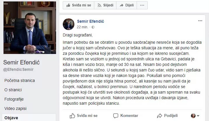 SARAJEVO, (Patria) - Načelnik općine Novi Grad Sarajevo Semir Efendić danas se oglasio na svom Facebook profilu nakon jučerašnje saobraćajne nesreće u kojoj je automobilom udario pješaka koji je preminuo nekoliko sati kasnije od zadobijenih povreda.