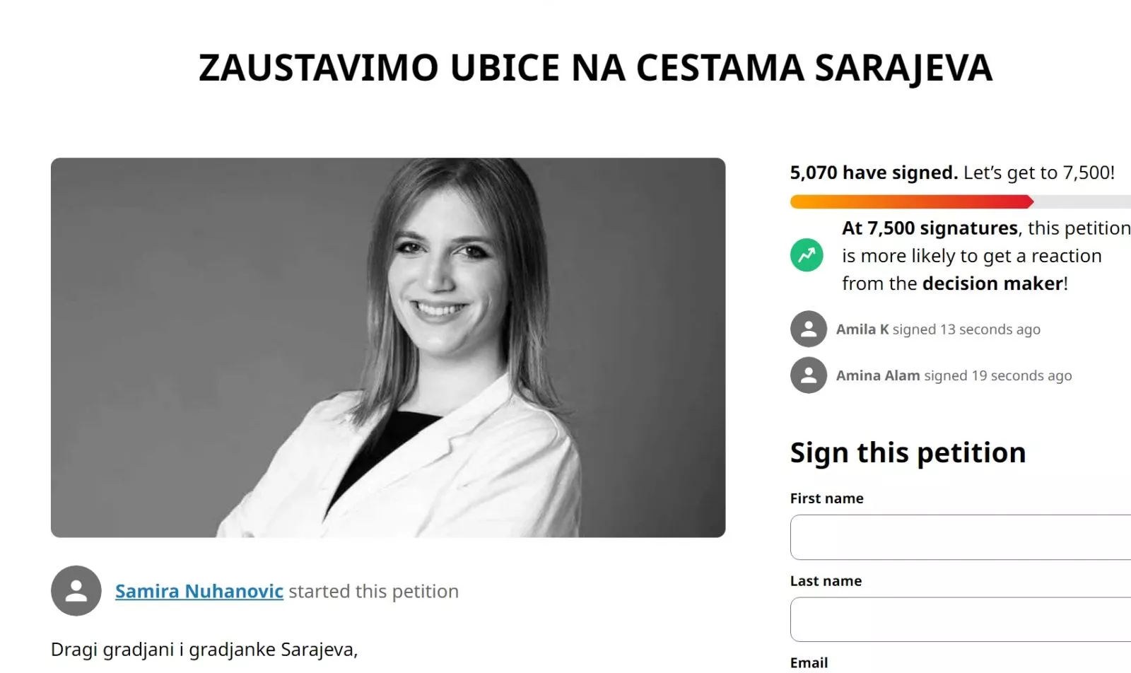 Samira Nuhanović, koja je pokrenula peticiju, poručila je kako ne možemo svi uraditi sve, ali da svako može uraditi nešto.